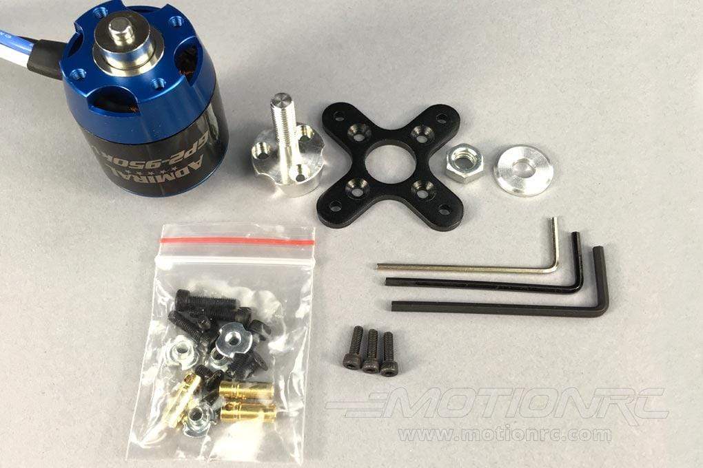 The Admiral GP2 3520-950kV is rated up to 415 watts and an equivalent to a .15ci/2.4cc nitro engine and ideal for scale and sports models weighing between 1000 - 1600g (35-57oz), be it your latest small scale balsa project or an upgrade to your favorite parkflyer sized PNP foamie and is intended for use with a 2-4 cell LiPo. As with all Admiral GP series motors, the GP2 comes supplied complete with a comprehensive set of mounting hardware, tools, X-plate mount and bolt on prop shaft.