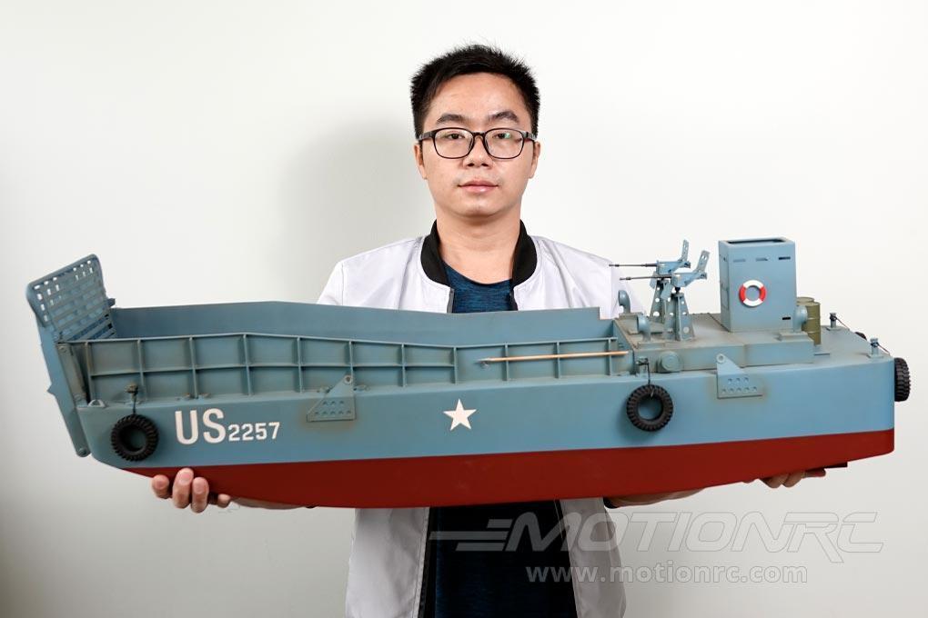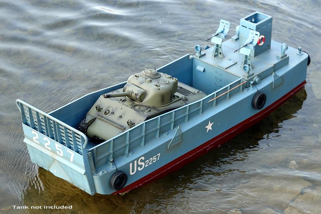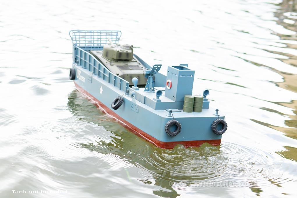 Display this vessel on your mantle or astonish your RC boat club with this functional RTR (Ready to Run) RC landing craft. Delivered Ready to Run (RTR), the landing craft can be operating within minutes of arrival, using the included 2.4Ghz radio transmitter and 2s Li-Ion battery. Only four AA batteries and minimal assembly is required.