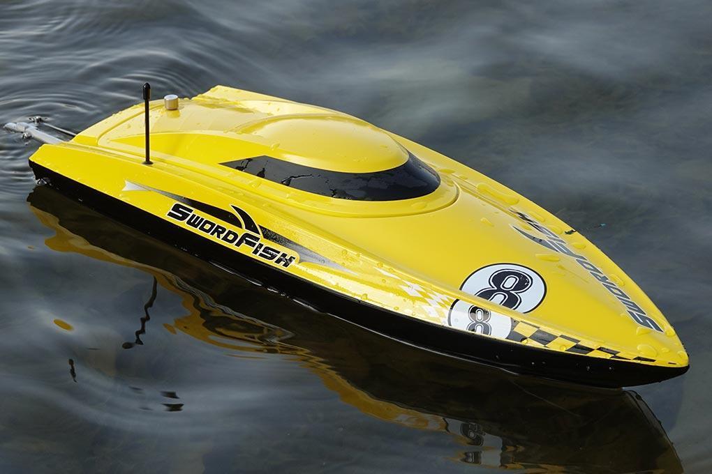Display this racing boat on your mantle or enjoy it on the water with this functional RTR (Ready to Run) model. Delivered Ready to Run (RTR), the Swordfish can be operating within minutes of arrival, using the included 2.4Ghz radio transmitter and 3S Li-Ion battery. Only four AA batteries and minimal assembly is required.