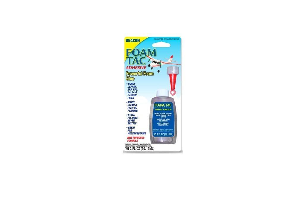 Beacon Foam-Tac is the perfect foam safe glue for all types of foam RC planes no matter what type of foam your plane is in your plane. Foam-Tac Bonds EPO, EPP, and Depron, Foam planes. Additionally Foam-Tac is great for building Balsa planes and even Carbon Fiber or Fiberglass planes. If you have a bad crash and break your wing in half, Foam-Tac will have you back in the air in 15 minutes. Note Foam-Tac is not safe for EPS foam.