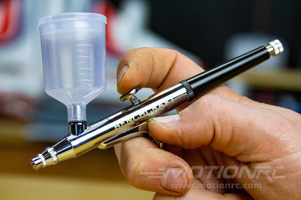 Constructed from metal machined and nickel-plated parts, this entry-level double-action airbrush is ideal for fine details and medium coverage with its incorporated 7cc paint cup and working pressure of 15-50 PSI.